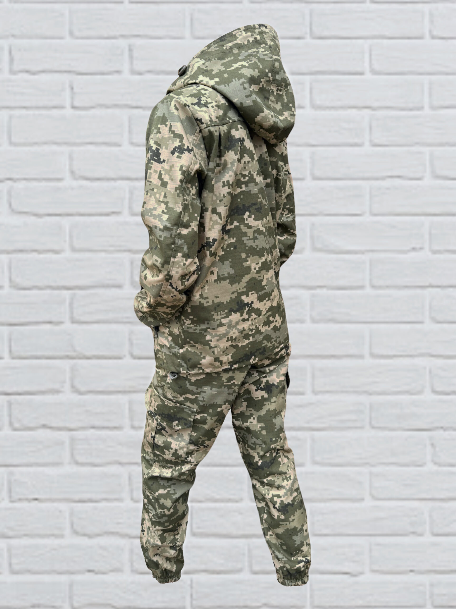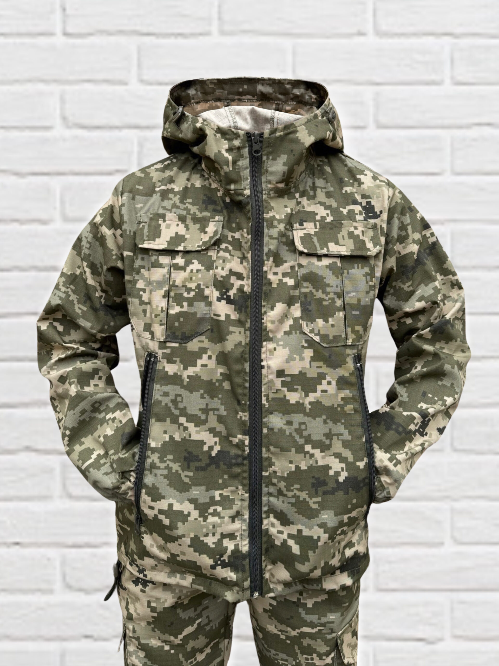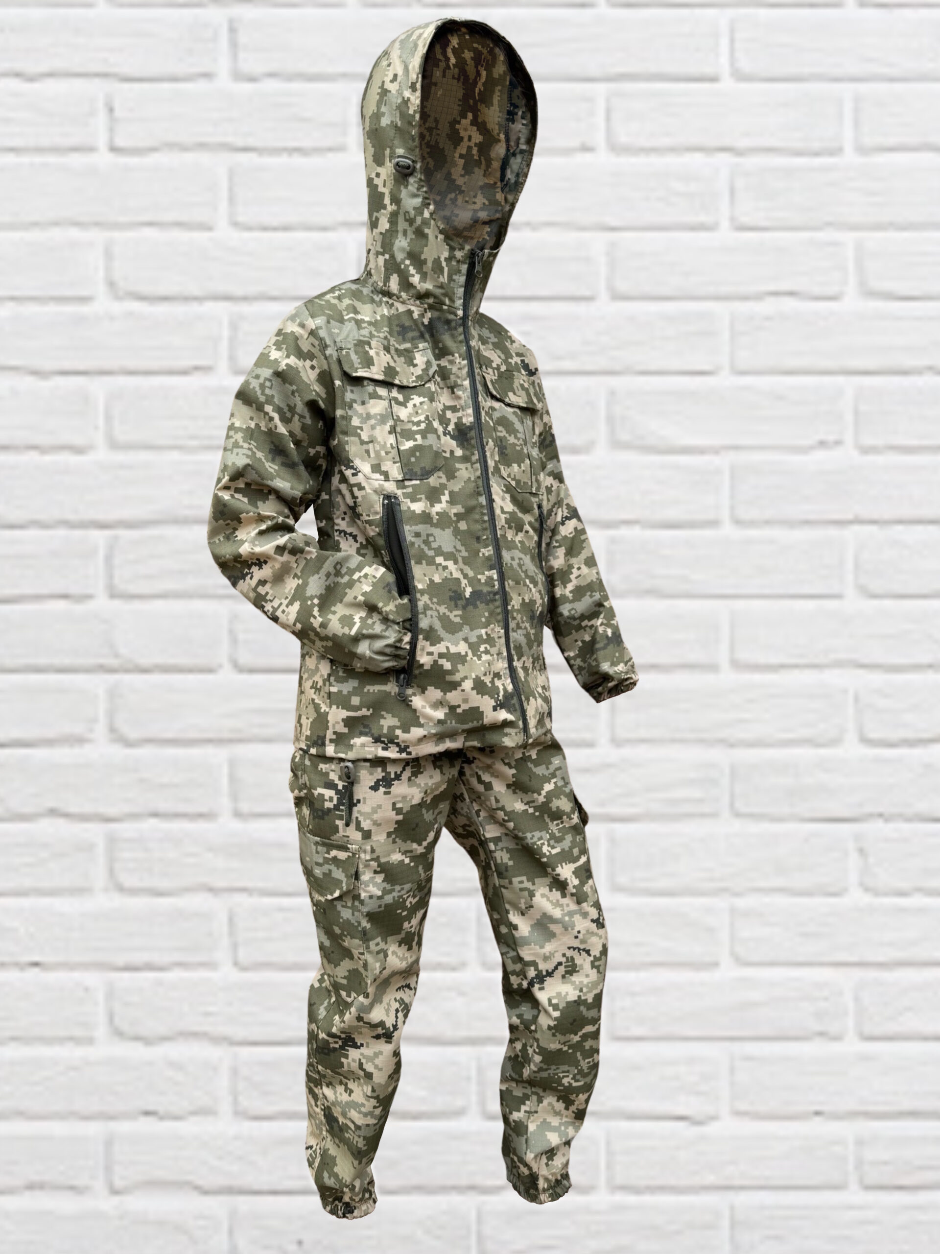 Маскувальний дитячий костюм легко переться і швидко сохне, він не мнеться і дуже простий у догляді та експлуатації. Камуфляжний дитячий костюм складається з куртки і штанів зручного крою. Куртка з капюшоном на блискавці має 2 кишені, штани мають 4 кишені. Обсяг капюшона регулюється. Завдяки щільно прилеглим гумкам на манжетах рукавів і штанів, костюм надійно захищає від вітру.