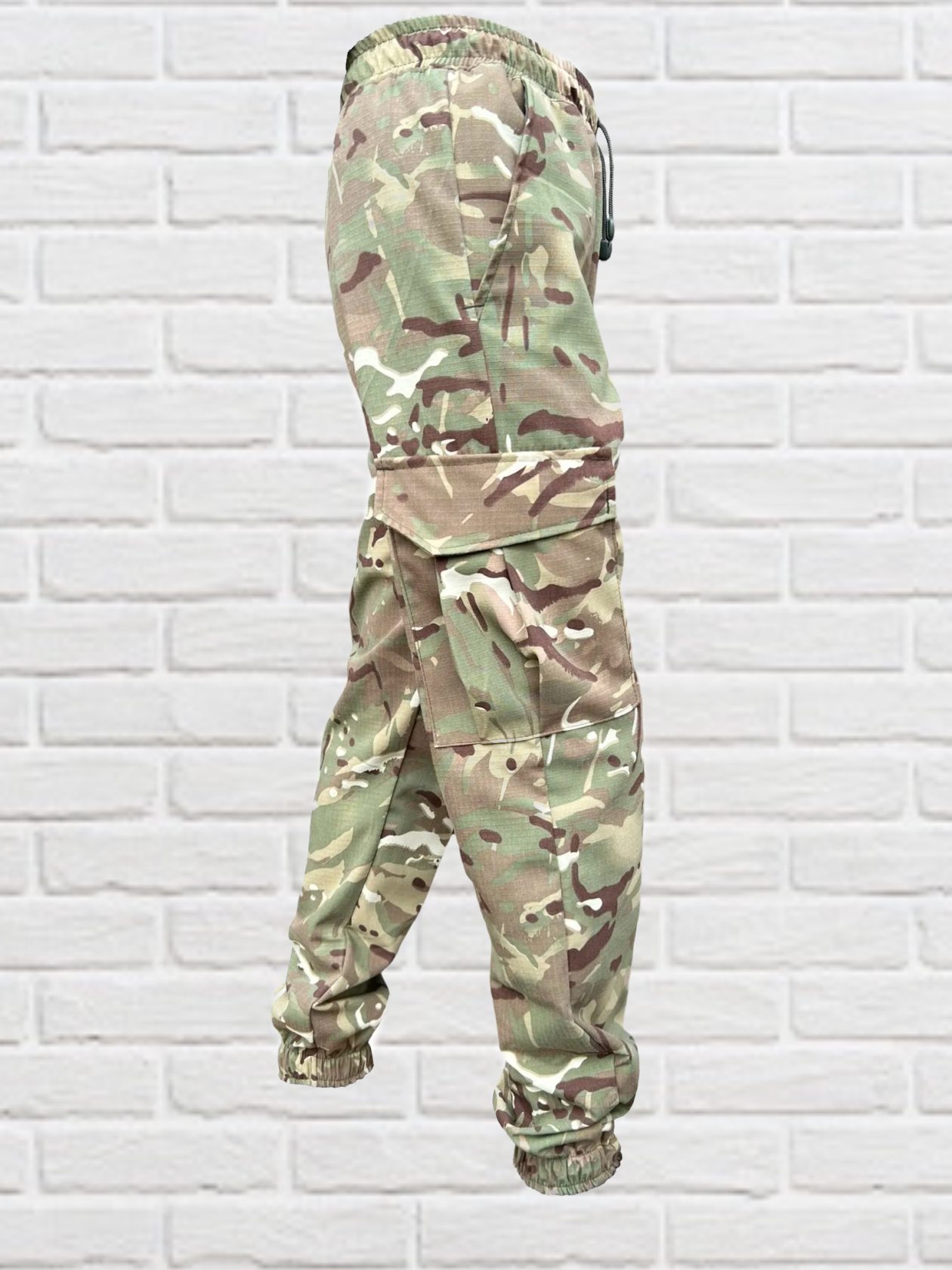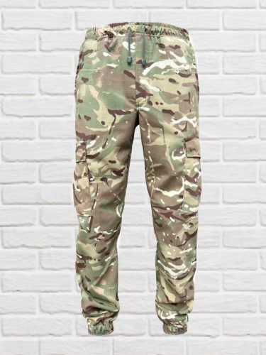 Штани карго до низу звужені з поясом на резинці і шнуром для фіксації. Мають дві бокові врізні кишені на талії і дві накладні кишені з клапанами на липучках в районі колін. Внизу штанини вшита резинка для прилягання до тіла.
