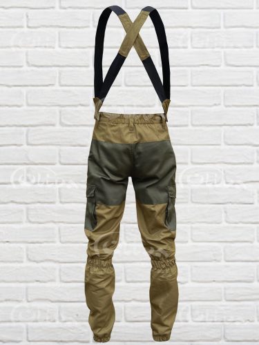 Крій костюма розроблений так, щоб при поєднанні накладок з основною тканиною – кольору хакі , забезпечити розбиття силуету людини на різних відстанях.
