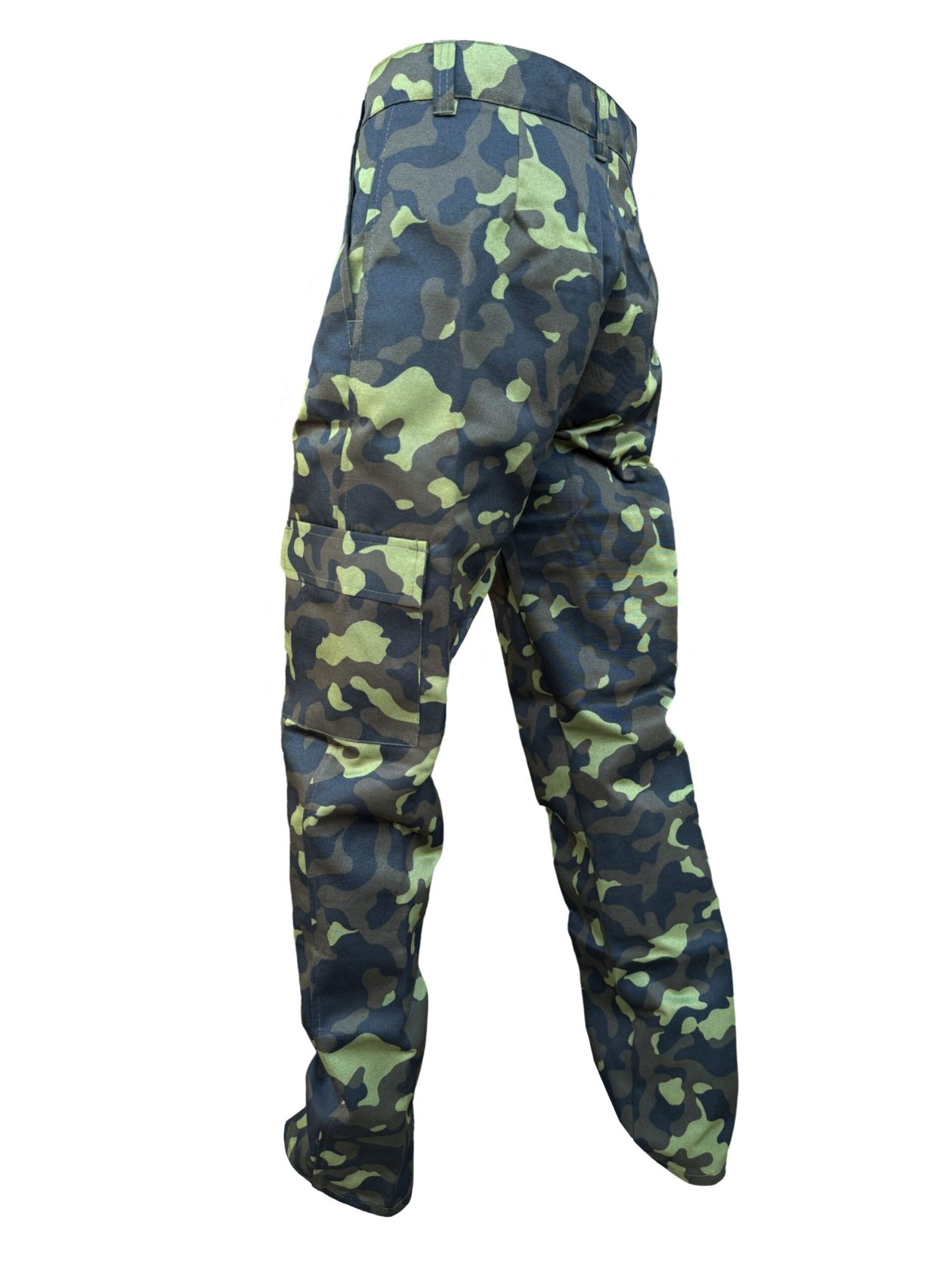 Штани вільного покрою з поясом під ремінь, гульфік на ґудзиках, мають дві бокові кишені на бедрах і дві бокові накладні з клапаном на липучках, в районі колін.