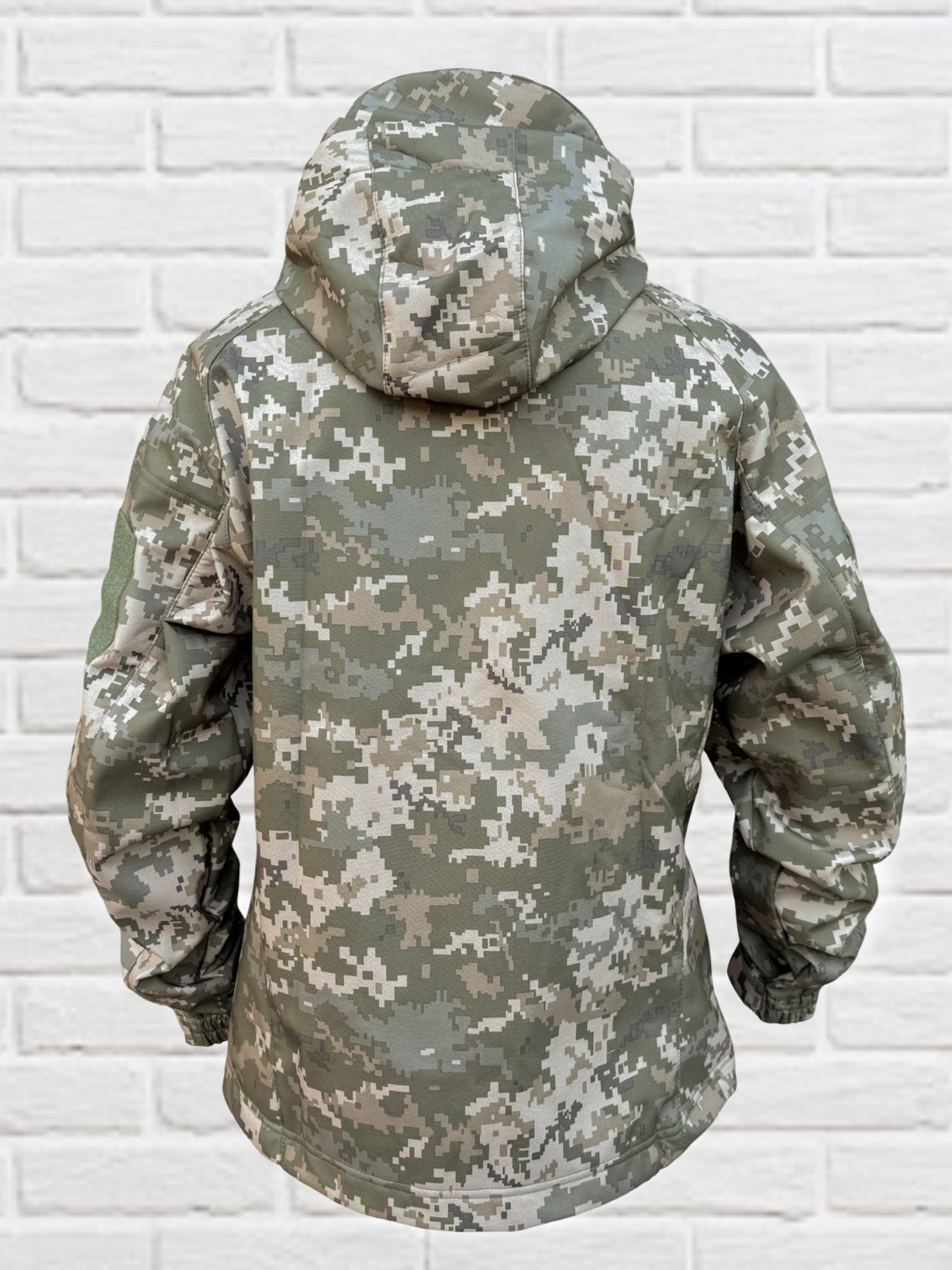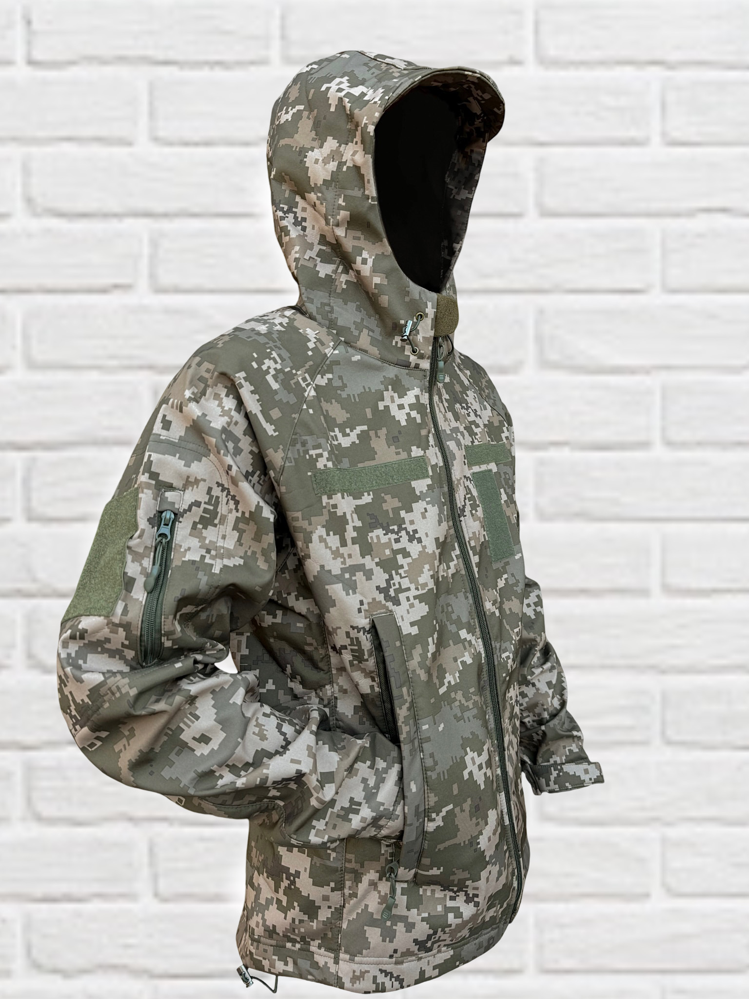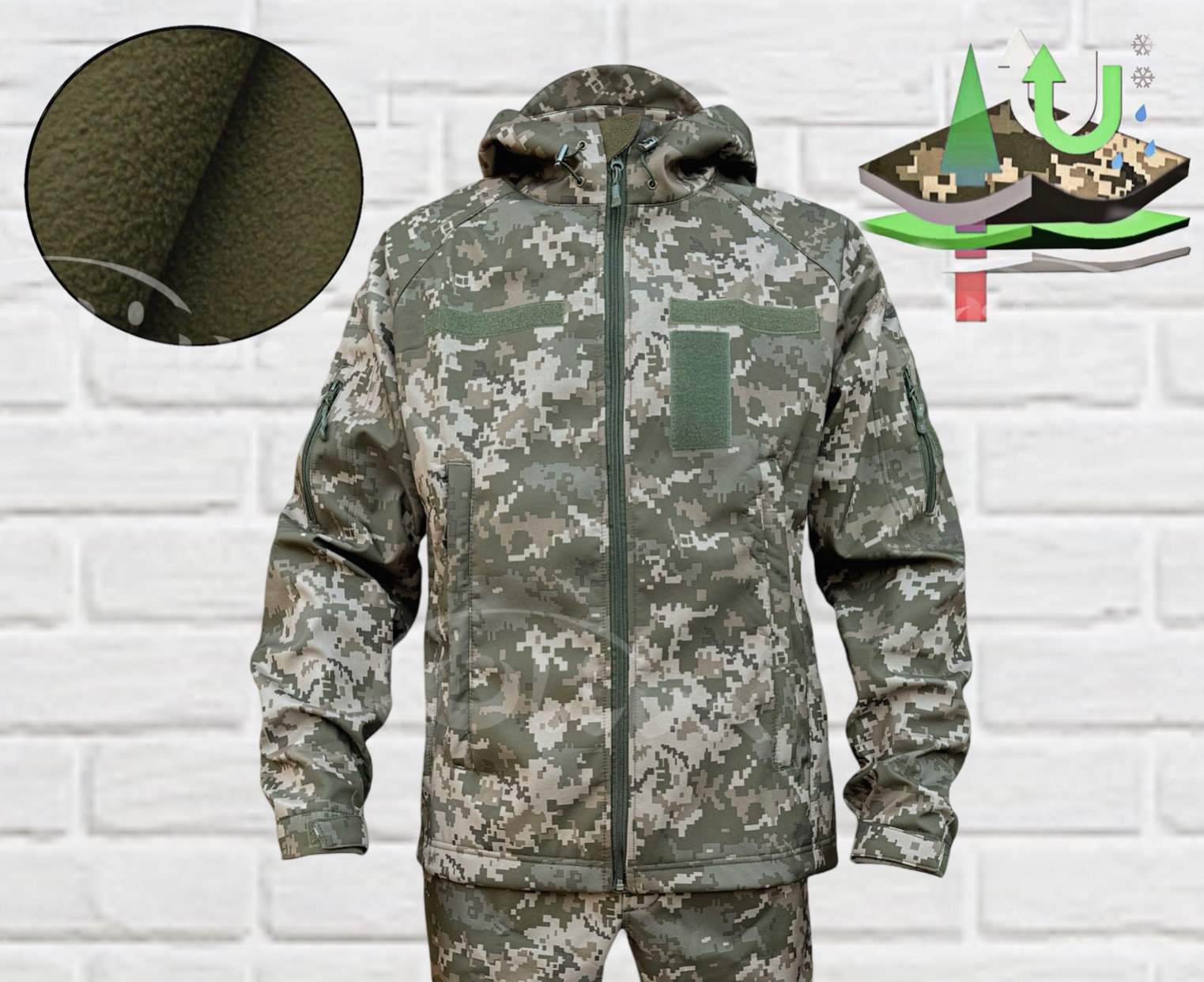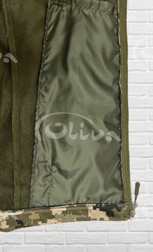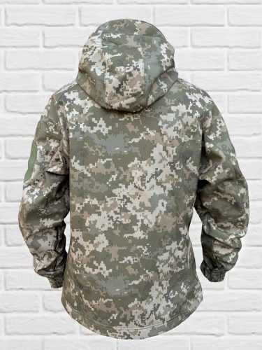 Куртка піксель пошита з тканини (Softshell) з мембраною. Верхній шар матеріалу не дає проникати волозі всередину. Верх із мембранного поліестеру захищає від холоду, поривистого вітру та дощу а внутрішня – регулює віддачу тепла і випарювань тіла.