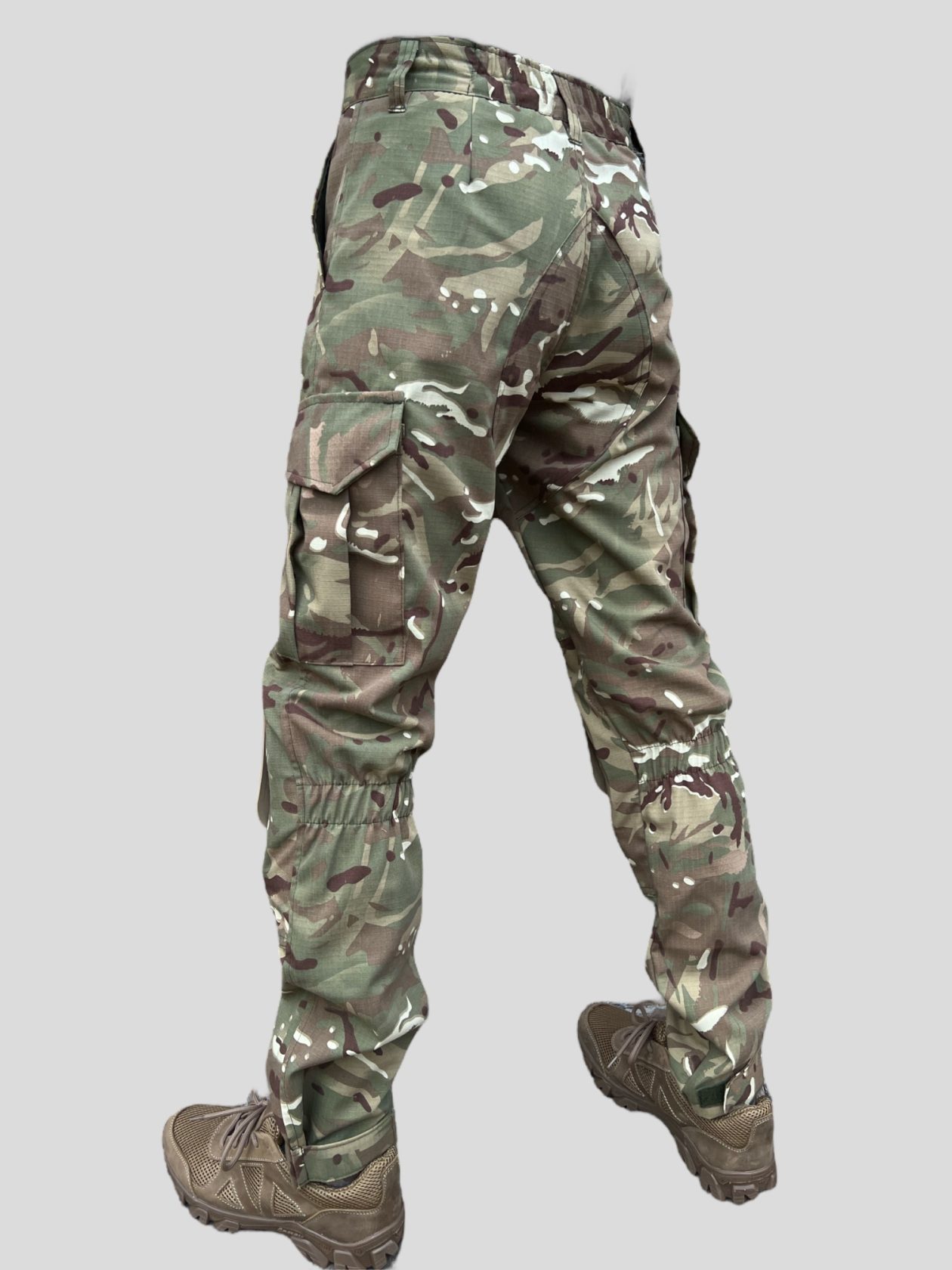 Штани вільного покрою з поясом під ремінь, гульфік на змійці, мають 4 кишені: дві бокові врізні кишені на бедрах , дві накладні кишені з клапанами на липучках в районі колін. Посилення в задній частині пошите в два шари тканини, для більшої міцності та зносостійкості. Під колінами мають стяжки на основі резино-тканинного тасьми. Низ штанів з регулюючим клапаном на липучці..