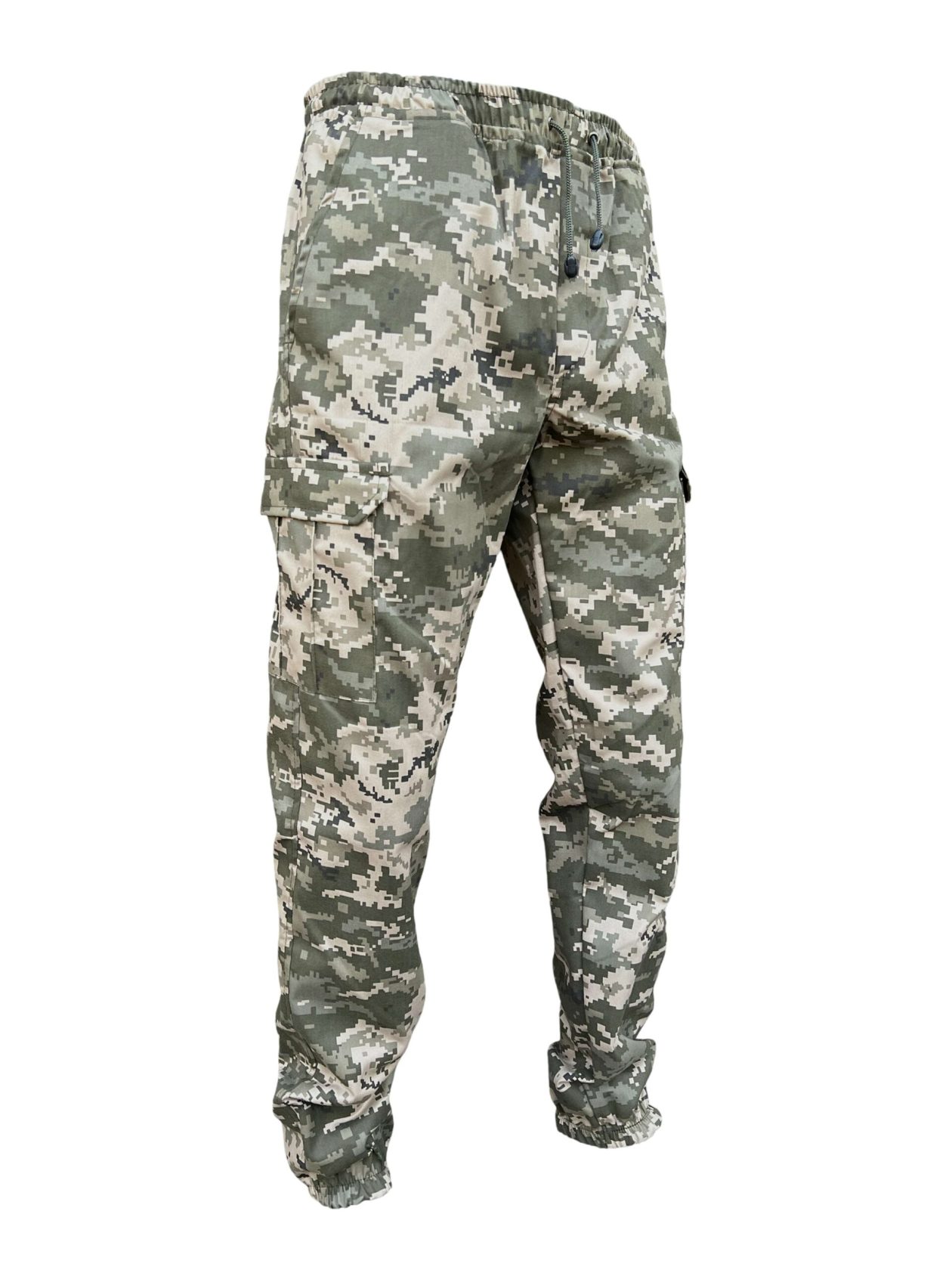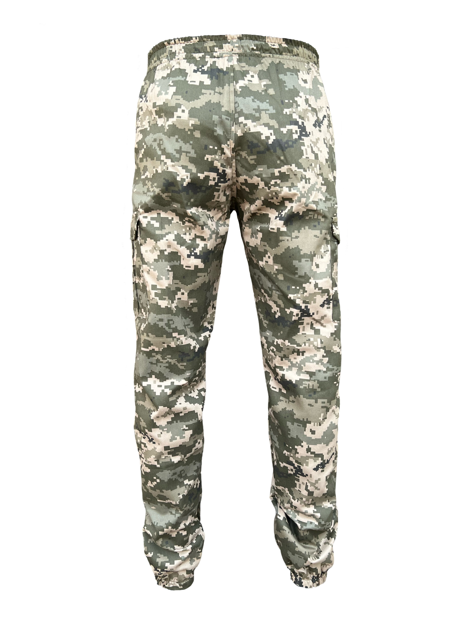 Штани до низу звужені з поясом на резинці і шнуром для фіксації. Мають дві бокові врізні кишені на талії і дві накладні кишені з клапанами на липучках в районі колін. Внизу штанини вшита резинка для прилягання до тіла.